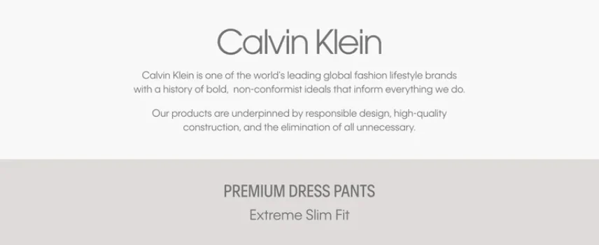 These dress pants from Calvin Klein feature a skinny fit and are made with stretch fabric for enhanced comfort and a modern look. Available in select sizes, they are ideal for both professional and casual settings.