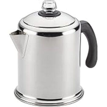 Enjoy delicious coffee with this traditional 12-cup stovetop percolator from Farberware. Its durable stainless steel construction ensures longevity and easy cleaning, making it a reliable choice for your morning brew.