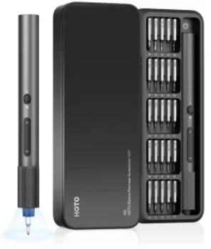 The HOTO W2 Electric Precision Screwdriver Set includes 25 interchangeable bits, making it ideal for electronics, appliances, and more. With a sleek black design, this electric screwdriver is both functional and stylish.
