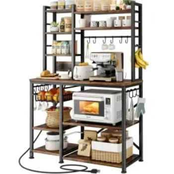 This stylish and functional baker rack is perfect for any kitchen or dining area. It includes a power outlet and 14 hooks for added convenience and storage.