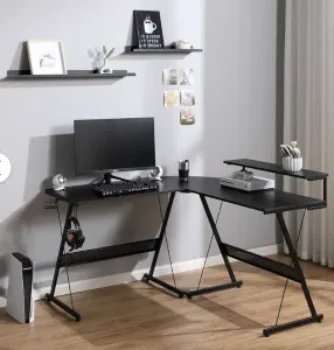 This gaming desk is designed to enhance your gaming experience with its spacious L-shape and practical storage options. Ideal for gamers looking for both style and functionality.